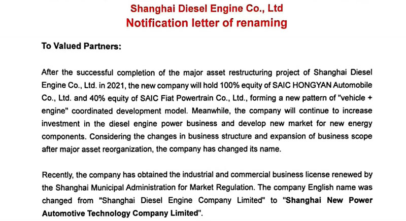 نام شرکت ما از SHANGHAI DIESEL ENGINE COMPANY LIMITED به Shanghai New Power Automotive Technology Company Limited تغییر کرد.