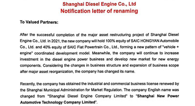 نام شرکت ما از SHANGHAI DIESEL ENGINE COMPANY LIMITED به Shanghai New Power Automotive Technology Company Limited تغییر کرد.